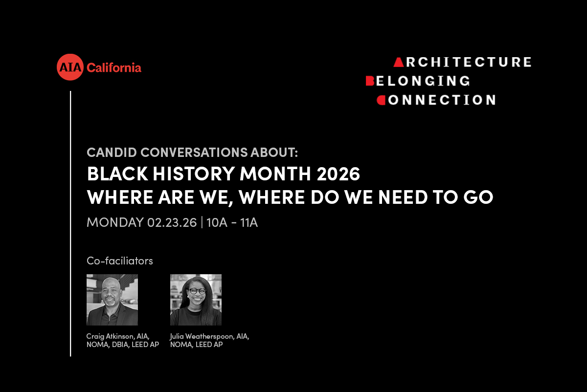 Architecture, Belonging, Connection Black History Month: Where Are We Now, Where Do We Need to Go Date: Monday, February 23, 2026 Time: 10:00A – 11:00A PST | Zoom For hundreds of years, architects who are Black or African American have faced persistent barriers. Over time, AIA, often in partnership with NOMA (National Organization of Minority […]